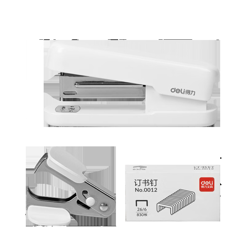 首页/ 得力(deli)12号订书机3件套(订书机 订书针 起钉器)适配12#钉白色TA359/