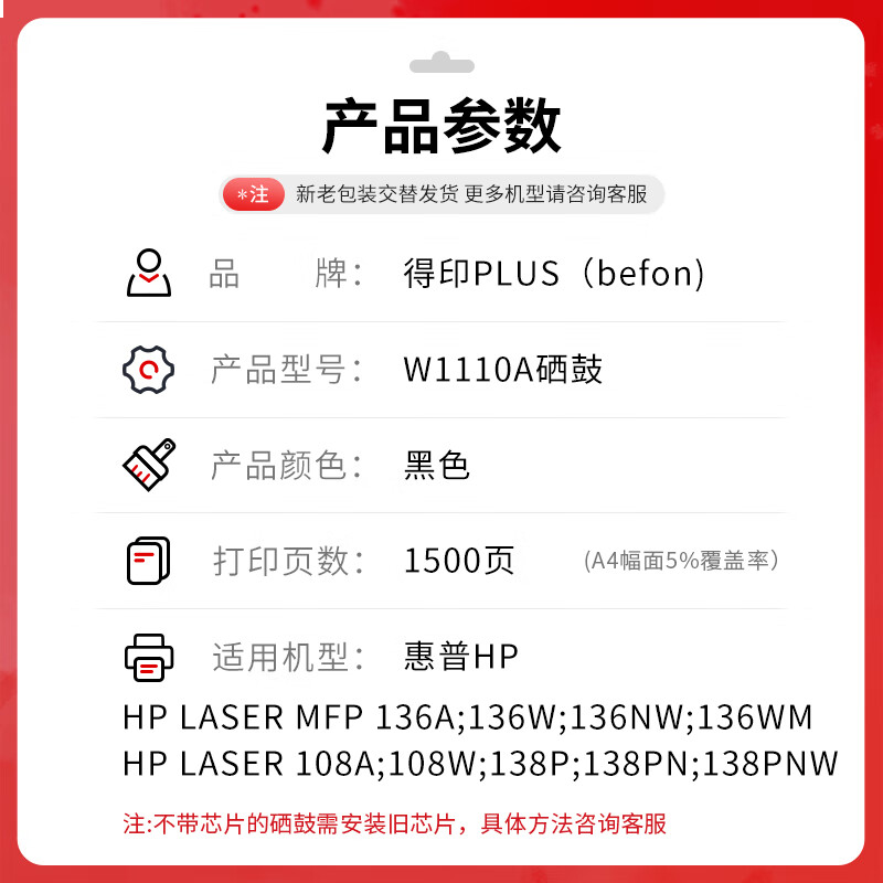 首页/ 得印PLUS版136w硒鼓110a适用惠普w1110a 108a/w136wm/w/nw/a 138/