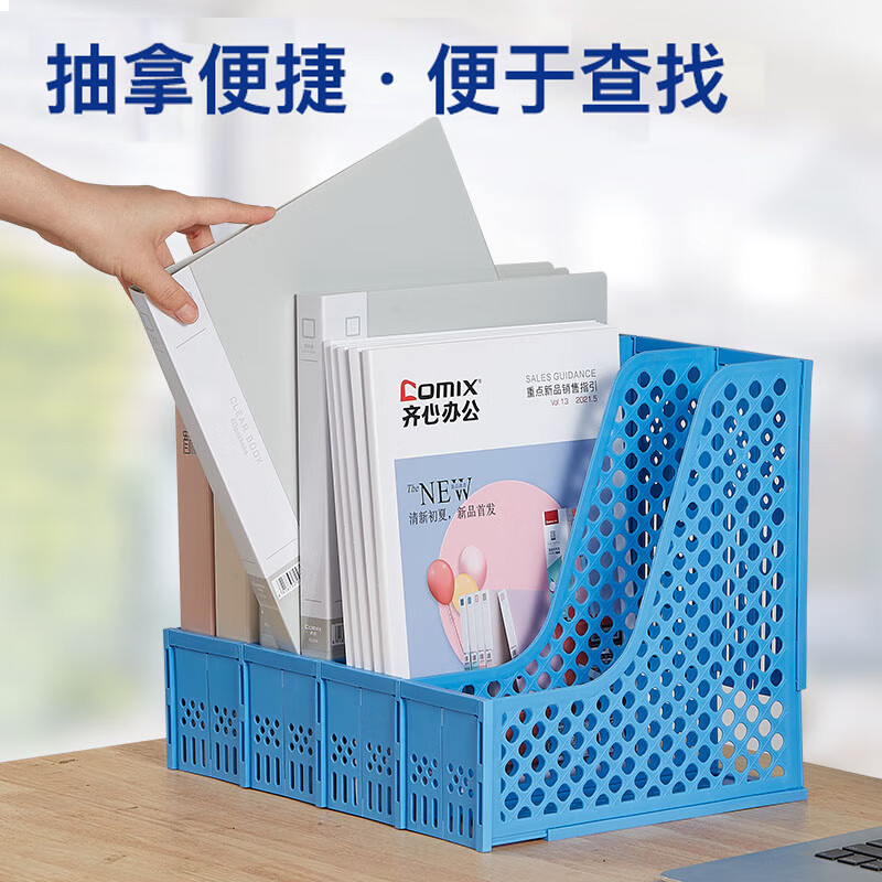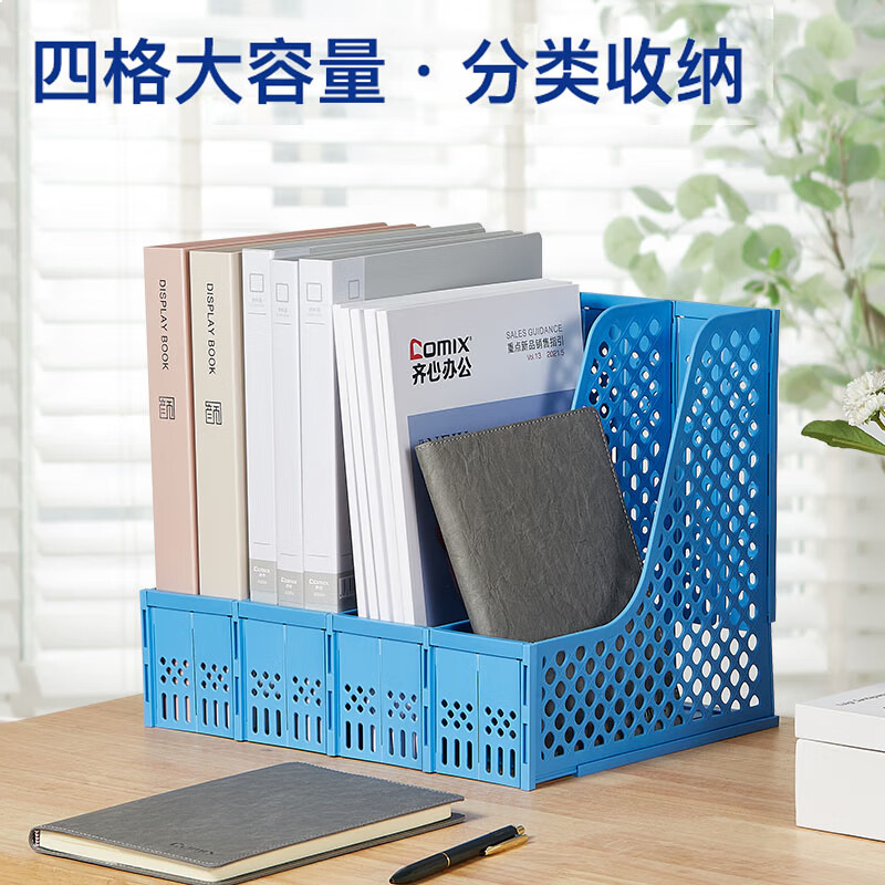 齐心可折叠四联文件框办公室桌面多层资料架子报告学生书立拉伸式文件架B2075蓝