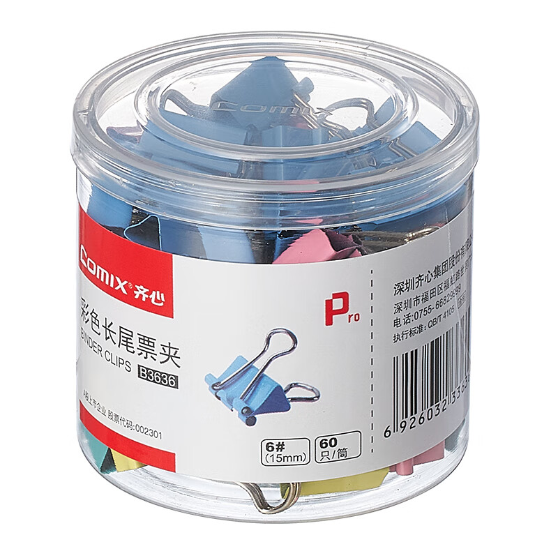 齐心(Comix)长尾夹/燕尾夹/票夹 彩色金属夹子 6#15mm 60只/筒 B3636