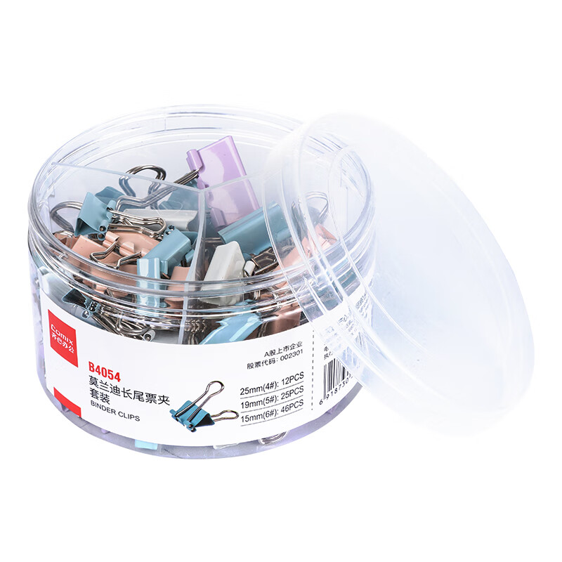 齐心83只莫兰迪多规格长尾票夹 (25mm12只 19mm25只 15mm46只)/筒 B4054
