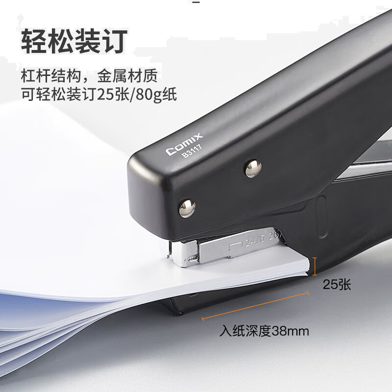 齐心 手握式订书机金属耐用订书器 外卖打包便携手持弹出式钉道(24/6-26/6) 黑色B3117