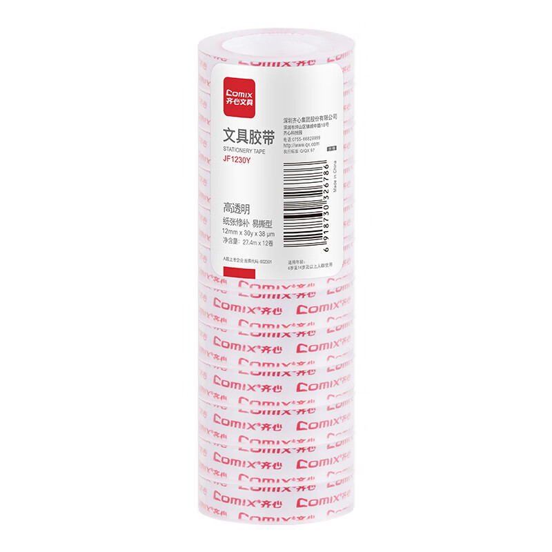 齐心(COMIX)透明胶带 易撕文具小胶带 12mm*30y*38μm 12卷/筒 JF1230Y
