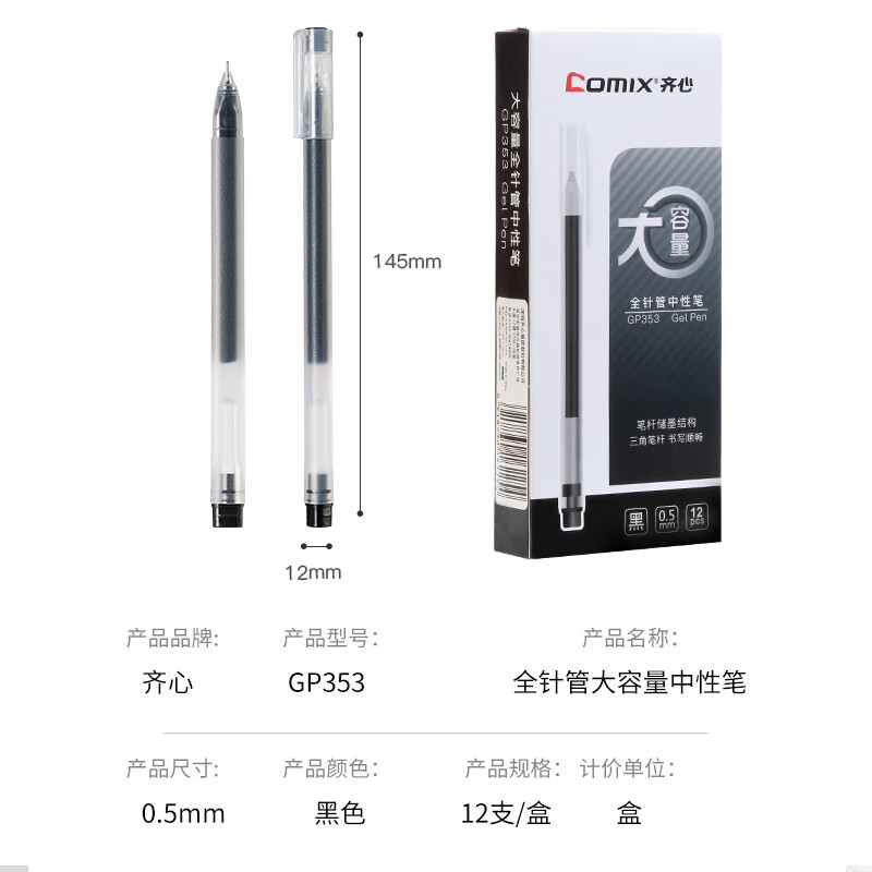 齐心 巨能写大容量中性笔签字笔水笔考试办公会议笔0.5mm 12支/盒 GP353 黑色