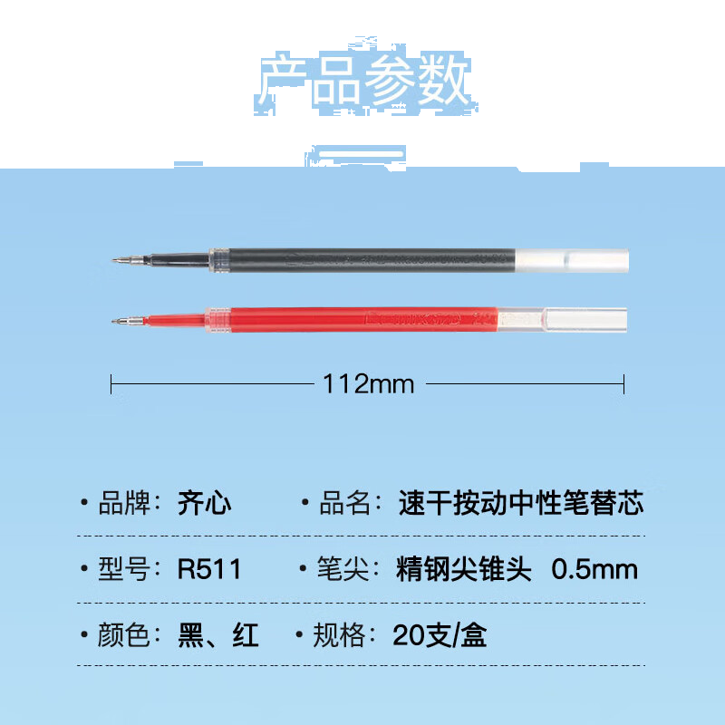 齐心(Comix)速干替芯按动中性笔ST尖精钢尖锥头笔芯 0.5mm红 20支装 R511