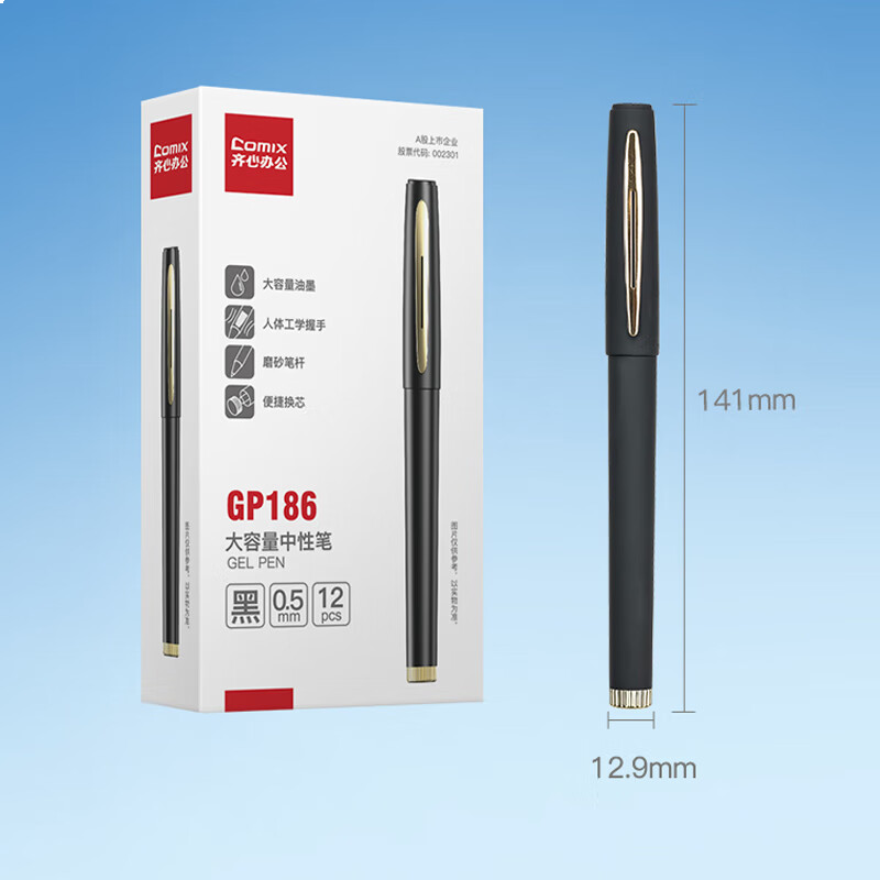 齐心(Comix)大容量磨砂拔帽中性笔签字笔 0.5mm子弹头 黑色 12支装 GP186