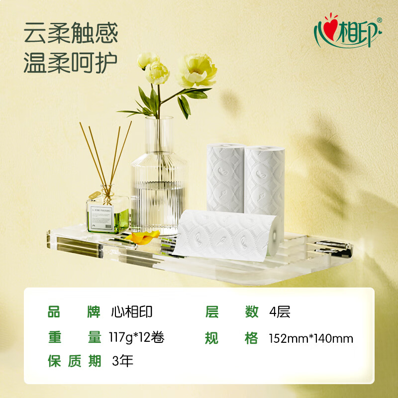 心相印无芯卷纸【肖战同款】云感柔肤4层117克*12卷 可冲散 卫生纸