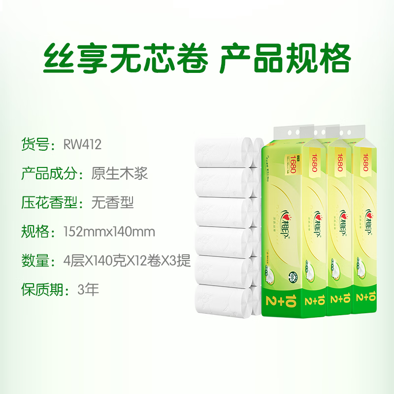 心相印无芯卷纸肖战同款茶语丝享4层140g*12卷*3提卫生纸新老交替