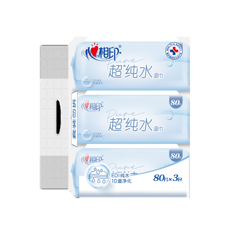 心相印EDI超纯水湿巾80片*3包 婴儿适用手口湿纸巾 亲肤温和不含酒精