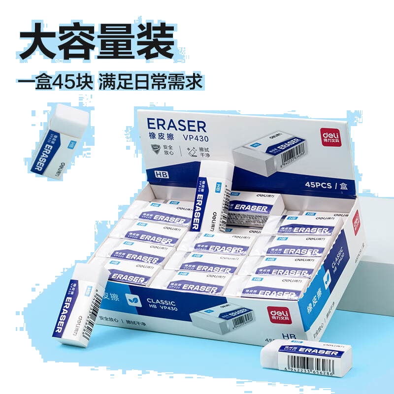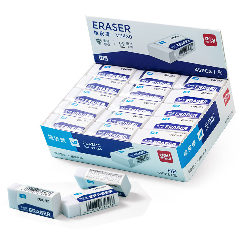 得力(deli)45块HB橡皮擦 聚屑易擦学生考试美术绘图素描橡皮 中高考文具中号