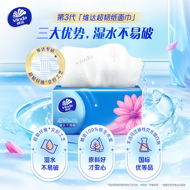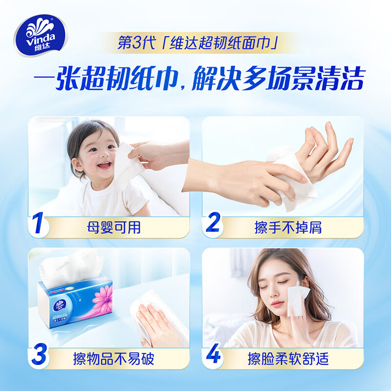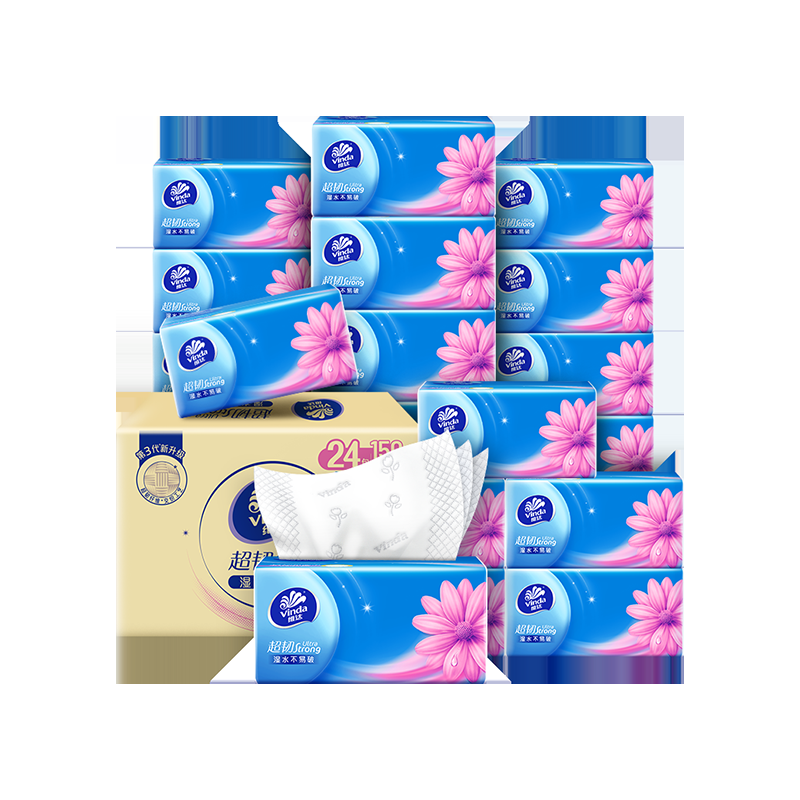 维达(Vinda)抽纸 超韧3层150抽*24包 真S码 湿水不易破 卫生纸 餐巾纸 整箱