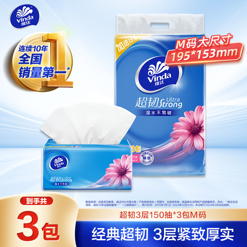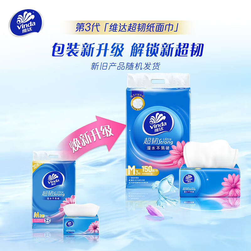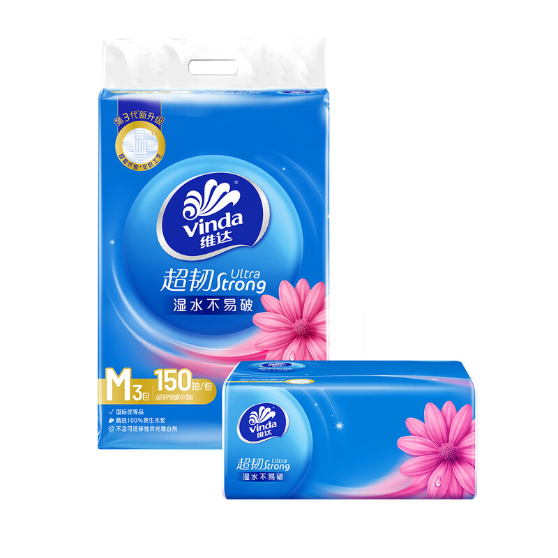 维达(Vinda)抽纸 超韧3层150抽*3包M码 湿水不易破 卫生纸 纸巾 餐巾纸 纸抽