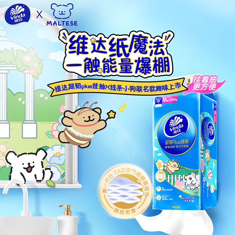 维达(Vinda)抽纸 超韧Plus挂抽3层280抽*8提M码 悬挂式线条小狗款 纸巾整箱