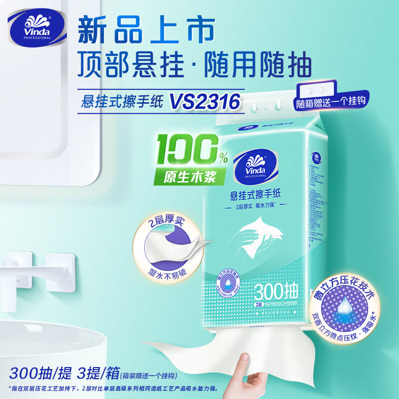 维达擦手纸2层300抽*3提 悬挂式(赠挂钩)挂抽商用抽纸巾整箱