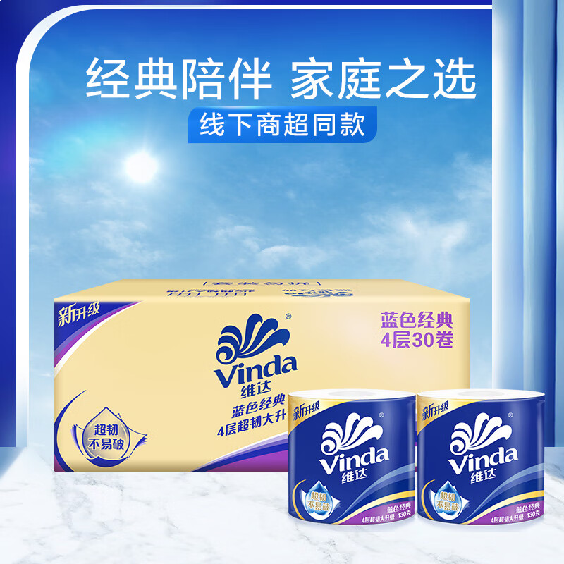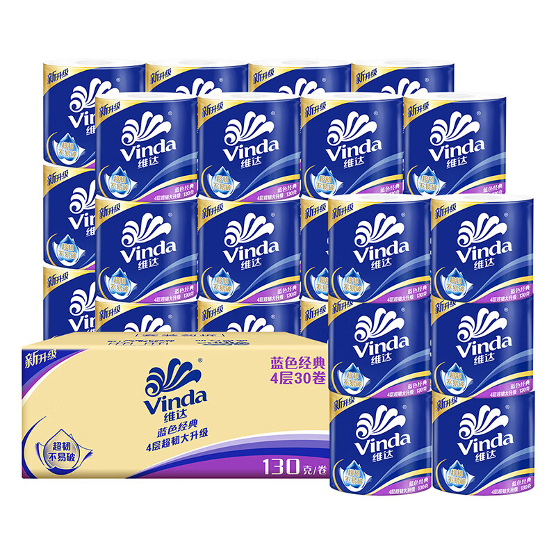 维达(Vinda)有芯卷纸 蓝色经典4层130克*30卷 厚韧耐用 卫生纸 卷筒纸纸巾