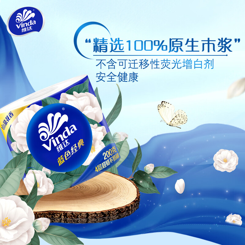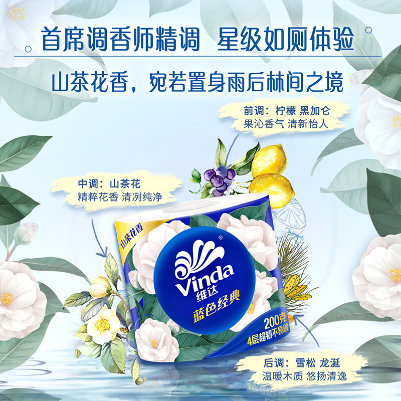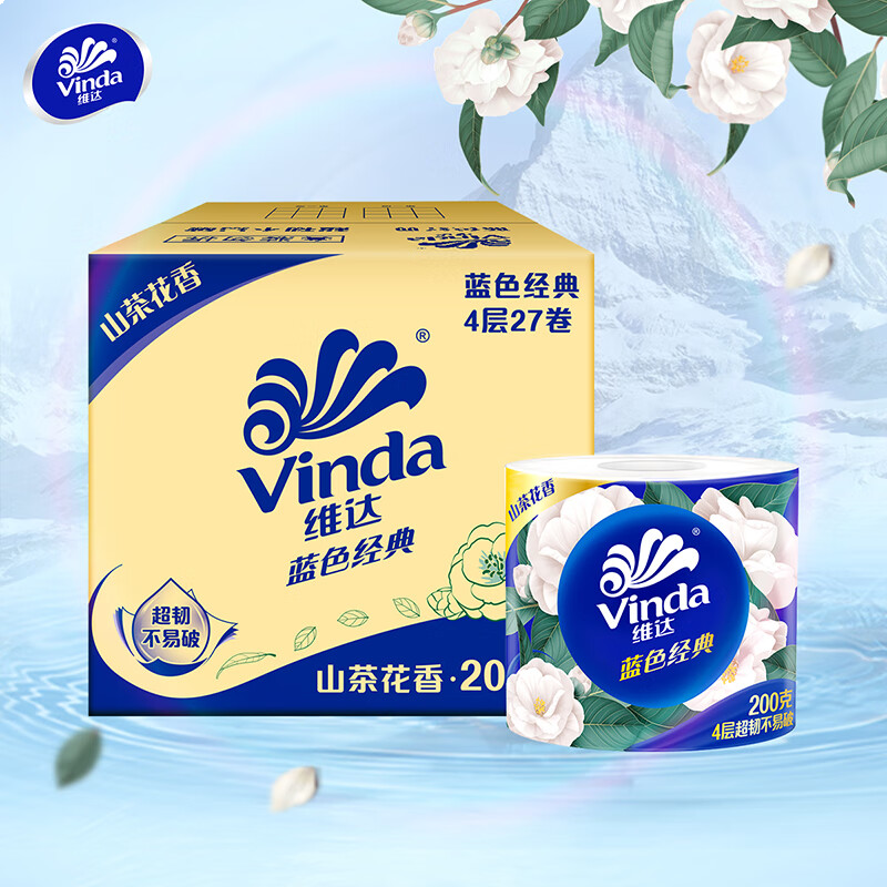 维达(Vinda)有芯卷纸 蓝色经典4层200克*27卷 山茶花香 卫生纸卷筒纸纸巾整箱