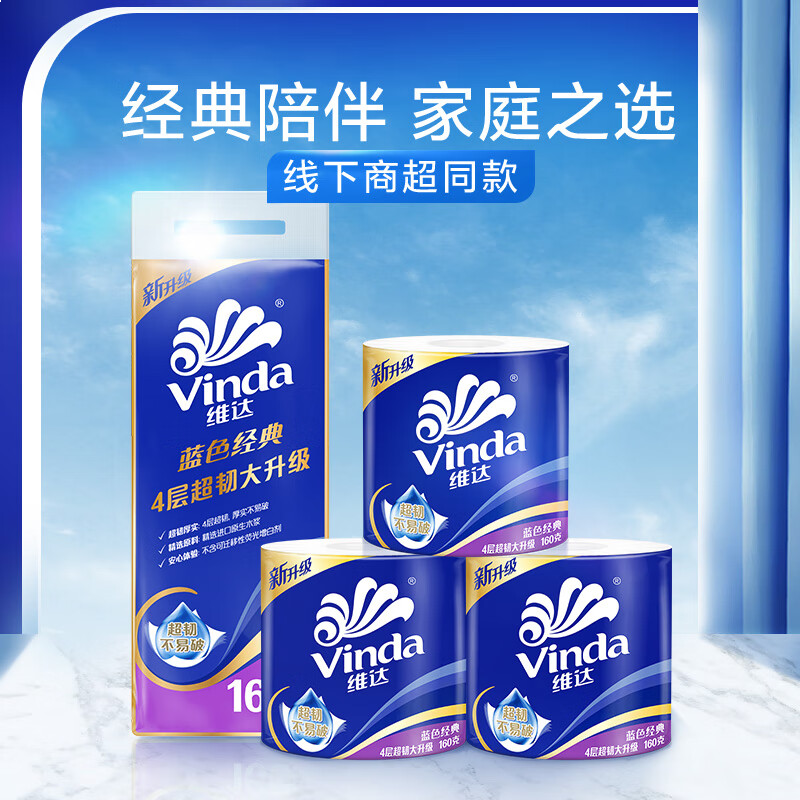 维达(Vinda)有芯卷纸 蓝色经典4层160克*10卷 厚韧大分量 卫生纸厕纸 卷筒纸