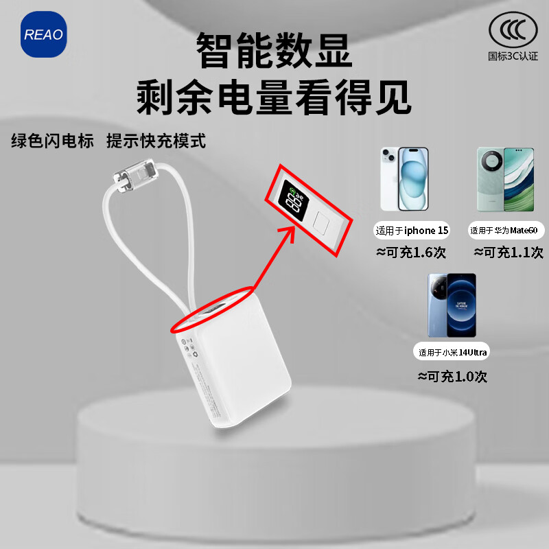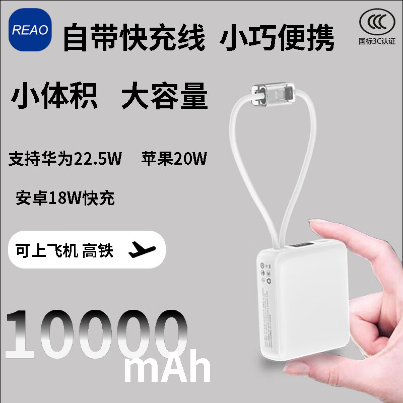 REAO泺澳C12迷你自带线快充移动电源充电宝10000毫安22.5W