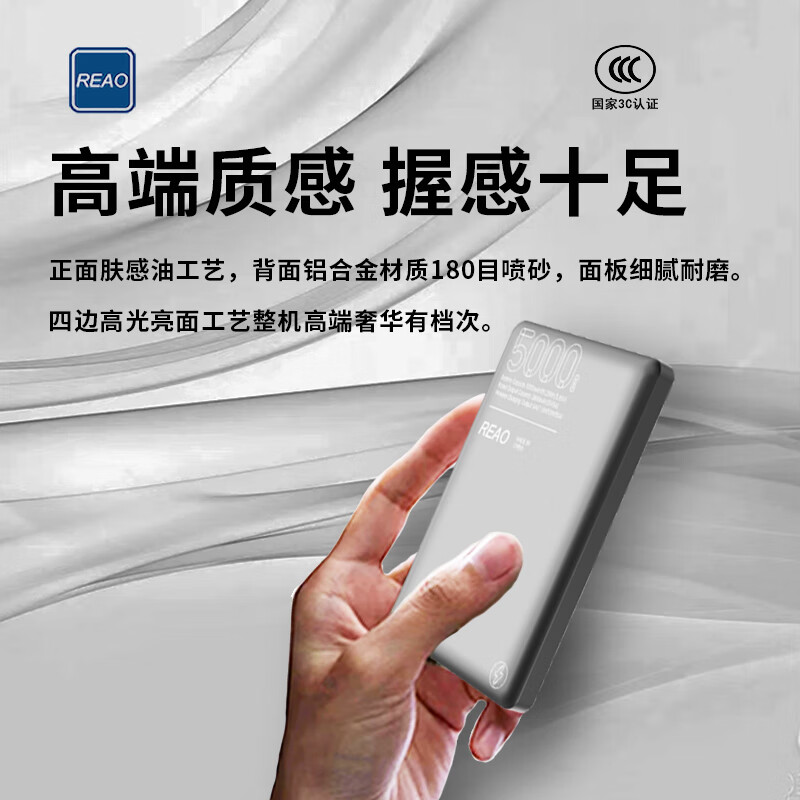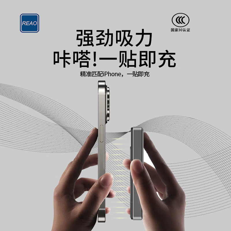 REAO泺澳充电宝3C认证可上飞机金属磁吸无线快充移动电源铝合金材质10000毫安C16浅灰色