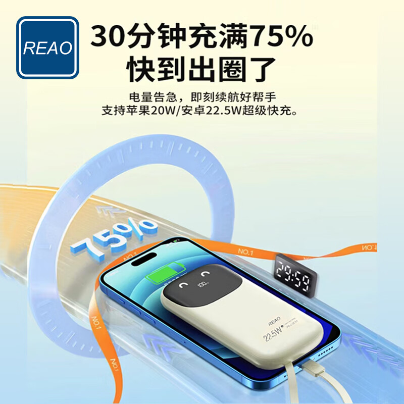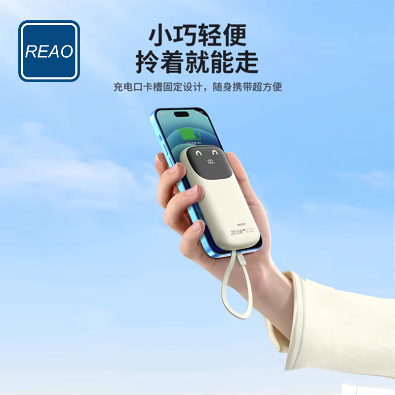 REAO泺澳充电宝3C认证可上飞机C8笑脸自带线数显快充移动电源10000MA 浅黄色